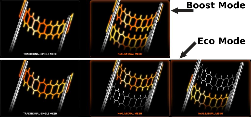 - When in Boost mode the NeXlim will heat up both mesh coils simultaneously, creating a larger heating surface than traditional single mesh pods which in turn greatly increases the flavour produced.