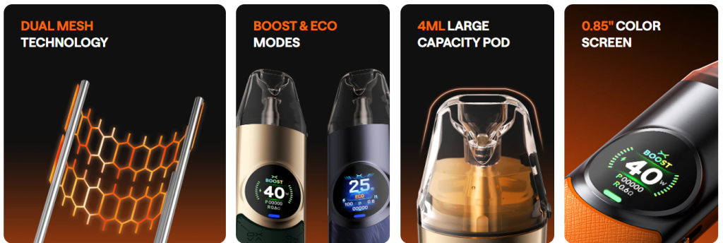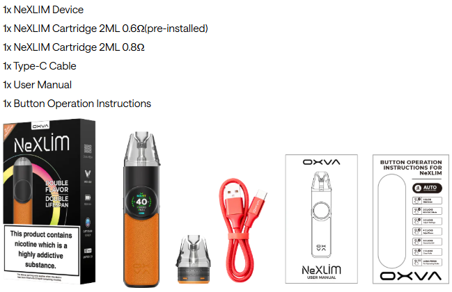 The OXVA NeXLIM represents the next generation of open pod systems, featuring advanced dual mesh technology. Equipped with a 4ml cartridge, a 1500mAh battery, and a 0.85″ colour display, delivering an output power of up to 40W. Double Flavour, Double Lifespan!