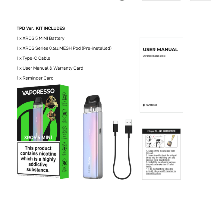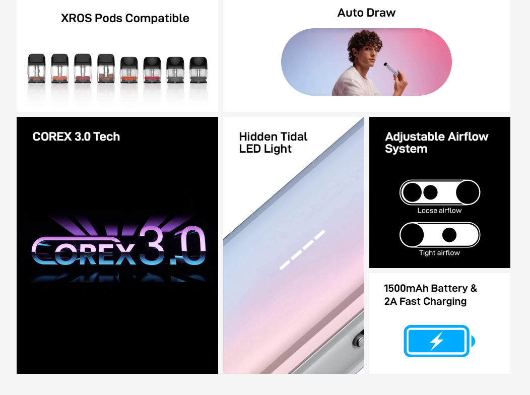 The XROS 5 MINI is a minimalist entry-level MTL device customized for those with an entry-level taste. Empowered by COREX 3.0 Tech, it provides users with a more constant and stable a richer aroma reproduction, delicate flavor, and smoother vaping experience. It has a 1500mAh battery and supports 2A fast charging. Adjustable airflow allow for customization, and hidden tidal light strips can visualize the change in power level.